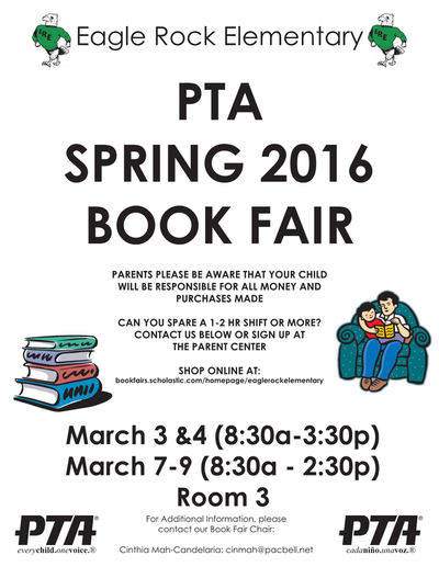 Our Annual Spring Book Fair returns to Eagle Rock Elementary beginning Thursday, March 4 through Wednesday, March 9 in Room 3 with operating hours: March 3, 4 (8:30a-3:30p) & March 7-9 (8:30a-2:30p).